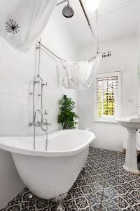 – Sleek renovated bathroom with shower and art deco style bath